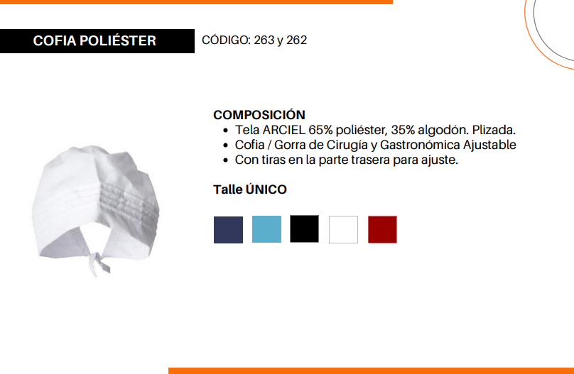 Tela ARCIEL 65% poliéster, 35% algodón. Plizada. Cofia / Gorra de Cirugía y Gastronómica Ajustable. Con tiras en la parte trasera para ajuste.